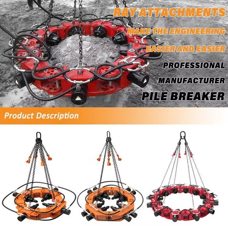 Cấu tạo: Thiết bị thường bao gồm một hệ thống các xi lanh thủy lực (các ngàm kẹp hoặc các thanh đột phá) được bố trí xung quanh đầu cọc bê tông. Các xi lanh này được kết nối với một nguồn năng lượng thủy lực (thường là bộ nguồn thủy lực độc lập hoặc lấy trực tiếp từ máy xúc hoặc trạm dầu).