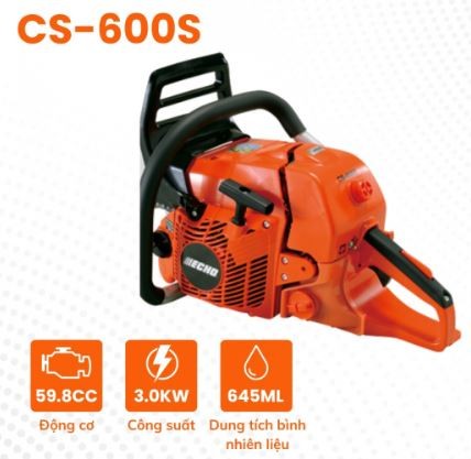 Máy cưa xích chạy xăng Echo CS600S là dòng máy cưa cành cây chạy xăng được sản xuất theo công nghệ tiên tiến nhất của Nhật. Máy cưa xích Echo CS600S là dòng máy hỗ trợ rất nhiều trong việc cắt tỉa cành. Được đánh giá cao bởi công suất lớn, vòng tua nhanh và cắt khoẻ.