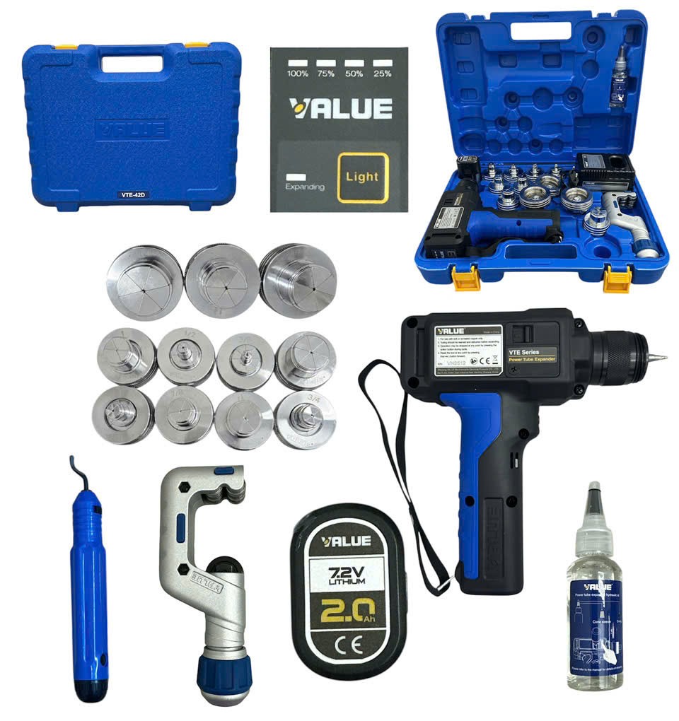 Bộ dụng cụ giãn lóng ống Value VTE-42D là mã hiệu của một sản phẩm máy nong ống đồng dùng pin (power tube expander) mang thương hiệu Value, được thiết kế để nong các đầu ống đồng cho hệ thống HVAC và điện lạnh một cách nhanh chóng và chính xác.
