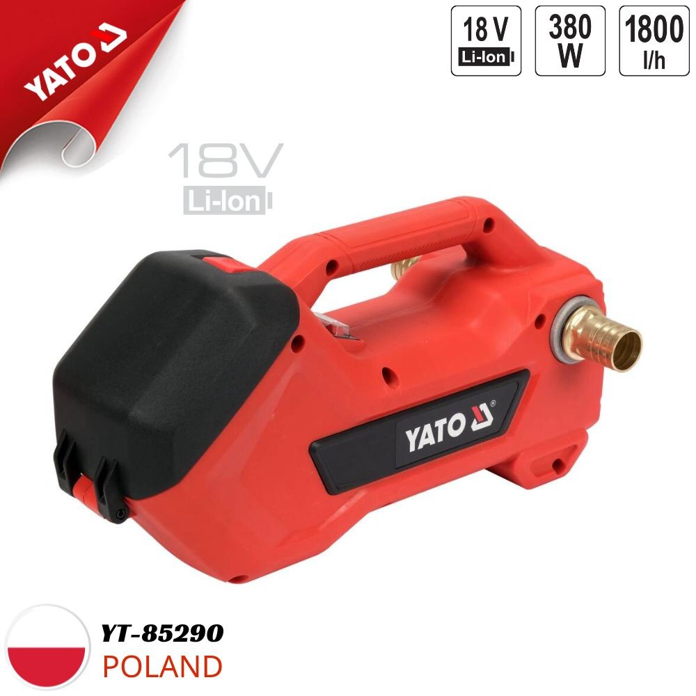 Máy bơm Yato YT-85290 mang đến sự tiện lợi tối đa nhờ hoạt động bằng pin Li-Ion 18V, đảm bảo tính cơ động và hiệu quả cao trong các công trình hoặc công việc ngoài trời.